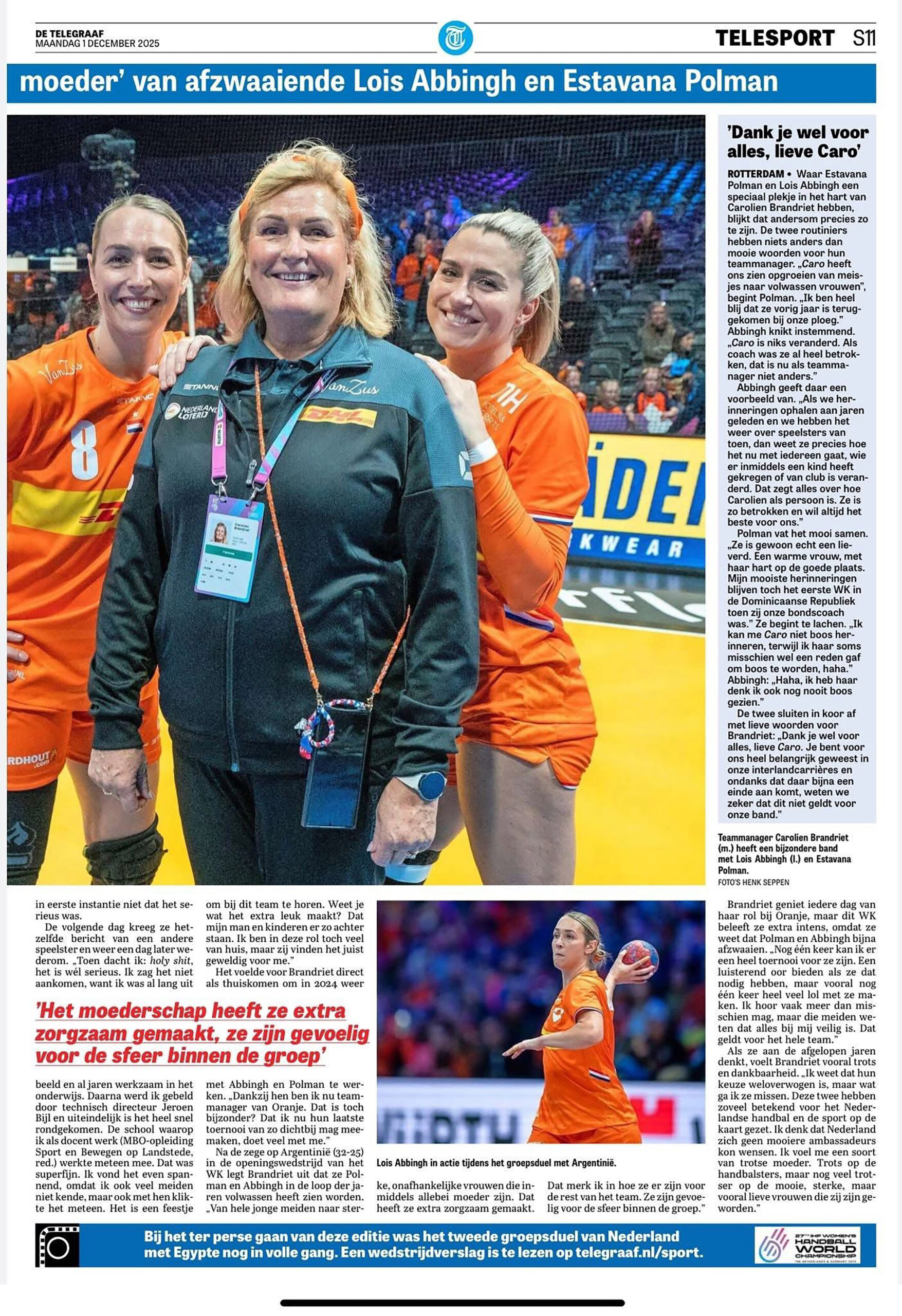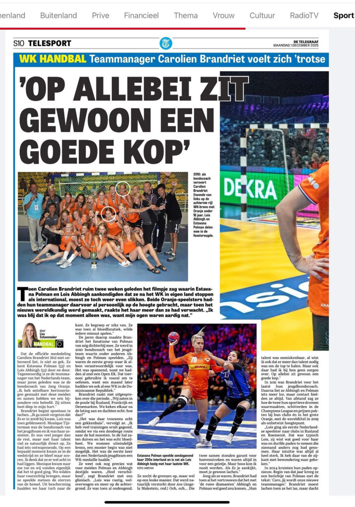 Een prachtig interview in de Telegraaf van maandag 1 december met ons bestuurslid talentontwikkeling Carolien Brandriet in haar functie als teammanager van het Nederlands handbalteam.